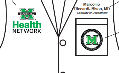 Faculty and staff may choose to use the Marshall Health Network and/or the School of Medicine logos for embroidery on white coats. The School of Medicine logo, represented by a 3.5” patch, should always be placed on the left breast pocket of the white coat. The Marshall Health Network logo and its affiliates should always be represented on the right breast of the white coat. Standard information listed above the pocket often includes the name, department, division or title, as shown below.